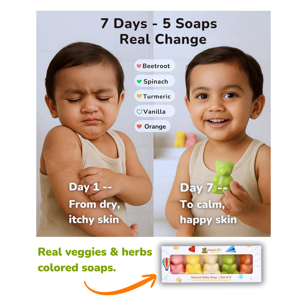 Introducing India’s FIRST HERBS-BASED COLORED SOAPS (set of 5): Gentle, Hydrating & Baby-Safe for Sensitive Skin, a delightful and nourishing bath-time essential for your little one. Each 75g soap bar is meticulously crafted with all-natural, Ayush-approved ingredients to ensure gentle cleansing and optimal care for your baby's delicate skin.